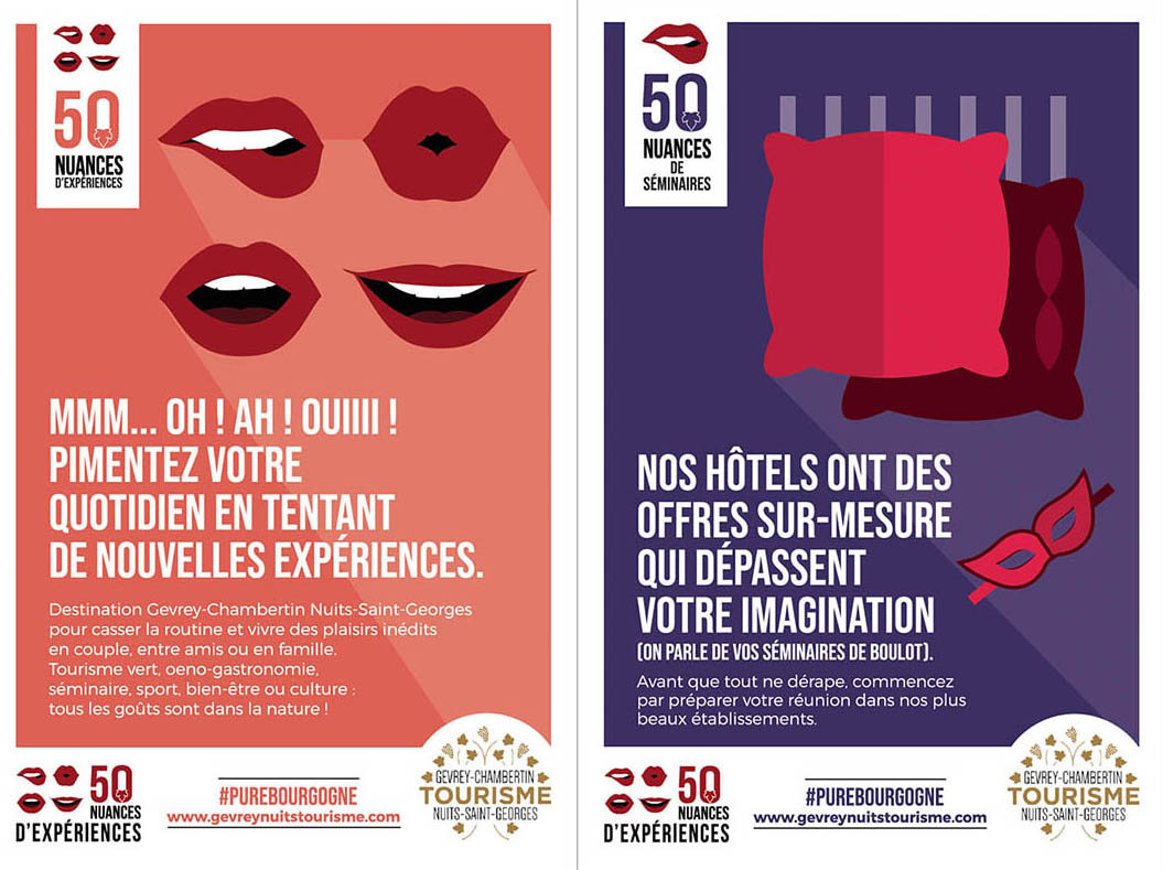 Afin de valoriser ses spécificités, son patrimoine riche et attractif et ses 1001 activités, l'Office de Tourisme Gevrey-Chambertin Nuits-Saint- Georges propose une approche pour le moins originale et volontairement débridée. Accrobranche, séminaires professionnels au pied des vignes, gastronomie, festivals de musique, dégustations… l'ensemble de l'offre est abordée via une campagne très visuelle, déclinée en version print sur le territoire et bien évidemment sur le volet digital, et les réseaux sociaux.