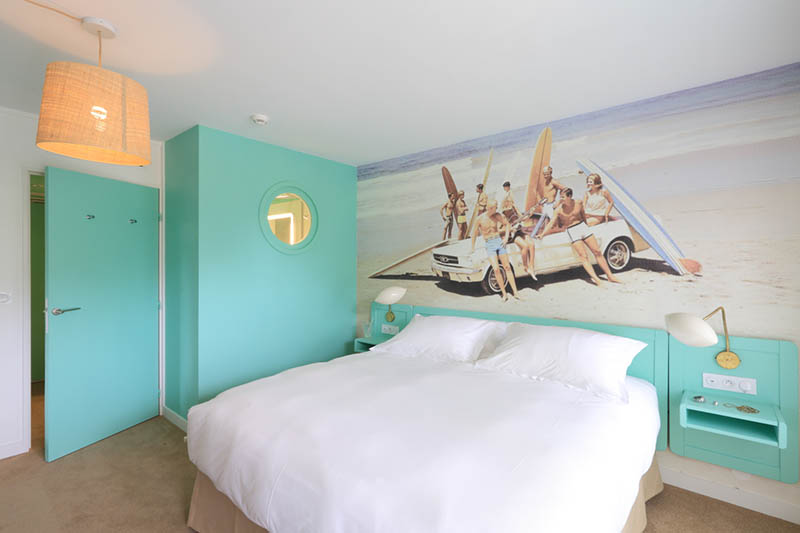 Le parti-pris du lieu ? Mixer le style rétro californien avec les codes actuels de l'hôtellerie à la française, en s'inspirant du lieu, la Côte d'Azur. La décoration a été mise en scène par François Dumas de l'Atelier 55. Elle privilégie la couleur et la lumière avec un décor chic-cool dans un esprit vintage 60-70. Chaque chambre ou suite se décline dans des coloris pastel acidulés sur fond de photos lifestyle XXL pixélisées, de rayures murales très Rodeo Drive version 70', de sol sablé, de claustras en béton coloré et de vrais cactus géants en pot.