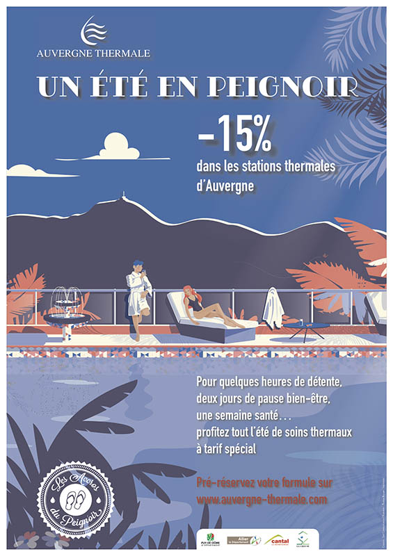 Afin de donner envie aux Auvergnats et aux touristes de profiter de ces offres spéciales, Auvergne Thermale dévoile une nouvelle affiche, composée autour d'une illustration de Thomas Bourget, déjà à l'oeuvre pour d'autres réalisations visuelles liées au secteur thermal (Printemps du Thermalisme, Weekend Mondial du Bien-Etre…)