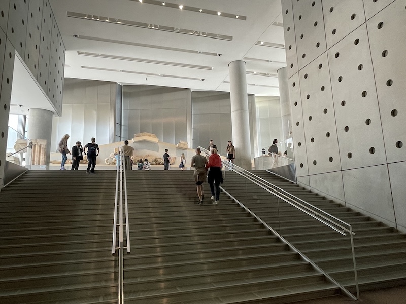 Les vastes baies vitrées plongent chaque salle dans une lumière naturelle et offrent des perspectives saisissantes sur l'Acropole, comme si les oeuvres s'inscrivaient dans leur décor originel. Dès l'entrée, le sol de verre révèle les ruines d'un quartier antique, permettant aux visiteurs de fouler l'histoire tout en prenant conscience de la superposition des époques.