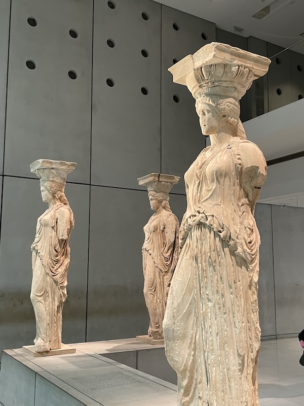 Au centre du musée, cinq des six cariatides de l'Erechthéion trônent dans un espace spécialement conçu pour elles. La sixième, conservée au British Museum, laisse volontairement un espace vide, symbole de leur séparation. Les statues visibles sur l'Acropole sont des copies, les originaux étant ici protégés de la pollution et des intempéries. Ce lieu empreint d'émotion illustre le lien entre mémoire, identité et conservation.