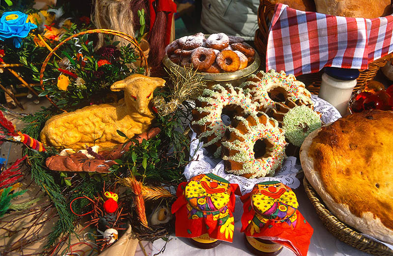 La coutume la plus importante est le Samedi Saint, cette journée est réservée à la bénédiction des oeufs décorés et des aliments disposés dans des corbeilles. Apportées à l'église, ces corbeilles sont composées de pain, qui représente le corps du Christ, d'oeuf, qui symbolisent la vie renaissante, d'eau, signe de préparation à une vie nouvelle et d'un petit mouton en sucre, symbolisant la victoire de la vie sur la mort. Le panier doit être décoré de buis, symbole de joie et d'espérance en la résurrection.