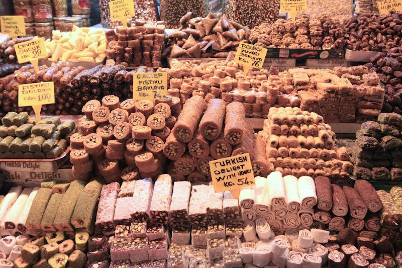 À Istanbul, le temps ne semble pas avoir d'emprise. Depuis plus de cinq siècles, mille et une boutiques exhibent des antiquités, tapis, bijoux et objets rares au Grand Bazar, le plus vaste bazar du monde. Arpentez le quartier historique, perdez-vous dans ces nombreuses ruelles et vous tomberez certainement sur le célèbre Bazar Égyptien. Situé à Eminönü, c'est l'un des marchés les plus anciens, certainement le plus beau, et le meilleur endroit pour faire provision de délices d'orient. Dans ce paradis des sens flottent les odeurs d'épices et de parfums, de thés, de gâteaux au miel et de loukoums ou de helva, ce gâteau friable obtenu à partir de jus de raisin et d'amandes pilées souvent parfumé au chocolat ou à la vanille. Saviez-vous que la profiterole fut inventée au début du siècle par une pâtisserie du quartier de Péra, comme le loukoum, inventé il y a trois siècle ?