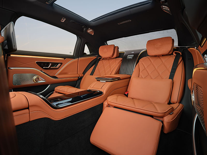 A bord de la Mercedes-Maybach Classe S, les membres bénéficient d'un espace généreux et d'un confort hors pair : sièges massants et inclinables, repose-pieds, tables pliantes… Chaque détail est pensé pour le bien-être : parfum Acqua di Parma, crème Colonia, eaux FIJI, chargeurs, serviettes rafraîchissantes et mouchoirs personnalisés.