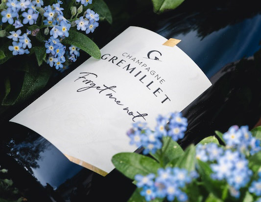 « Il s'avère que notre nom de famille - Gremillet - figure parmi les principaux synonymes de la fleur Myosotis, aussi connue sous le nom de Vergissmeinnicht en allemand ou « Forget-me-not » en anglais. Dans le langage des fleurs, cette espèce sauvage possède certaines des plus belles symboliques : fidélité, amour éternel, souvenir, renouveau ou encore espoir. » nous dit Anne Gremillet,en charge du marketing et de la communication au sein de la maison Champagne.