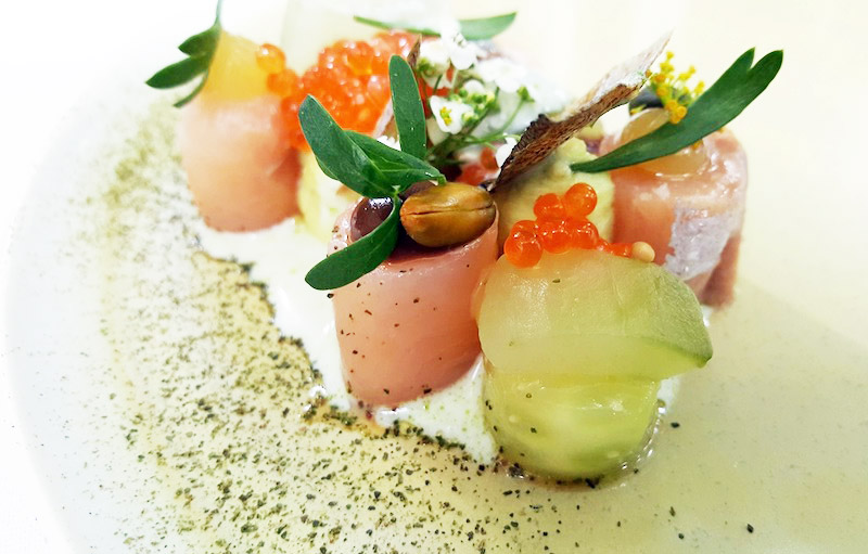L'Omble Chevalier Ikejime du Frais Baril, concombre, pointes d'ail noir, pistaches caramélisées, oeufs de truite, kéfir à la ciboulette.