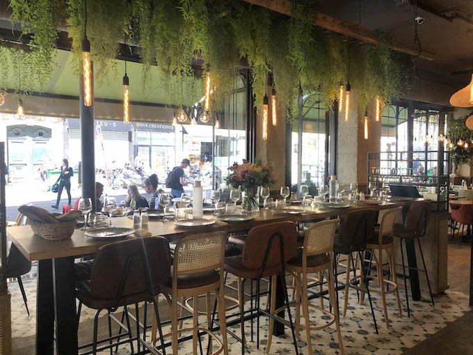 Au sol des carreaux de ciment, un carrelage façon parquet vieilli, une verrière d'atelier, la reconstitution d'une devanture de pâtisserie qui rappelle le concept atypique du lieu : un restaurant boulangerie/pâtisserie.
