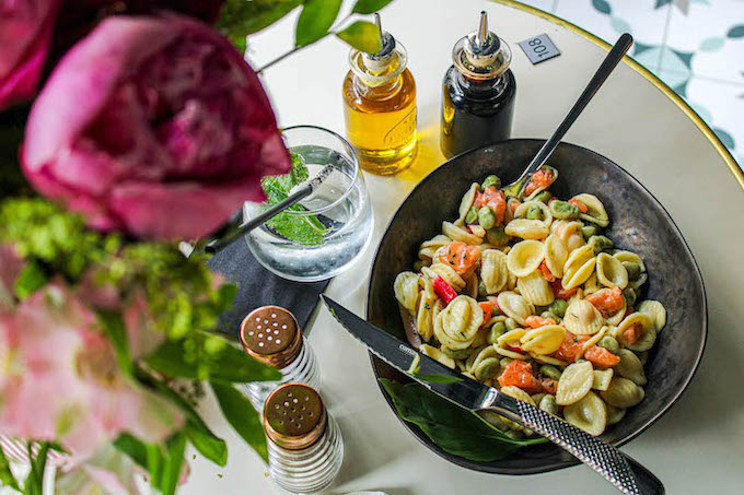 Pour déjeuner, un choix de plats entièrement faits maison, jusqu'aux frites, pimentés d'une dose d'originalité et toujours à base de fruits et de légumes maraîchers, le choux-fleur est décliné sous plusieurs formes, le saumon gravelax est servi avec des pickles de légumes… Parmi les plats, la rascasse est accompagnée de piperade et sauce dugléré, le suprême de volaille est servi avec des carottes au gingembre et un jus de viande à l'orange. Le risotto de petit épeautre bio de la ferme du Chailloué dans le Perche est mijoté avec des petits légumes, parmesan et émulsion d'ail. Quant au burger et son pain maison bien évidemment, il est accompagné d'une compotée d'oignons, poitrine fumée, cantal et sauce cocktail.