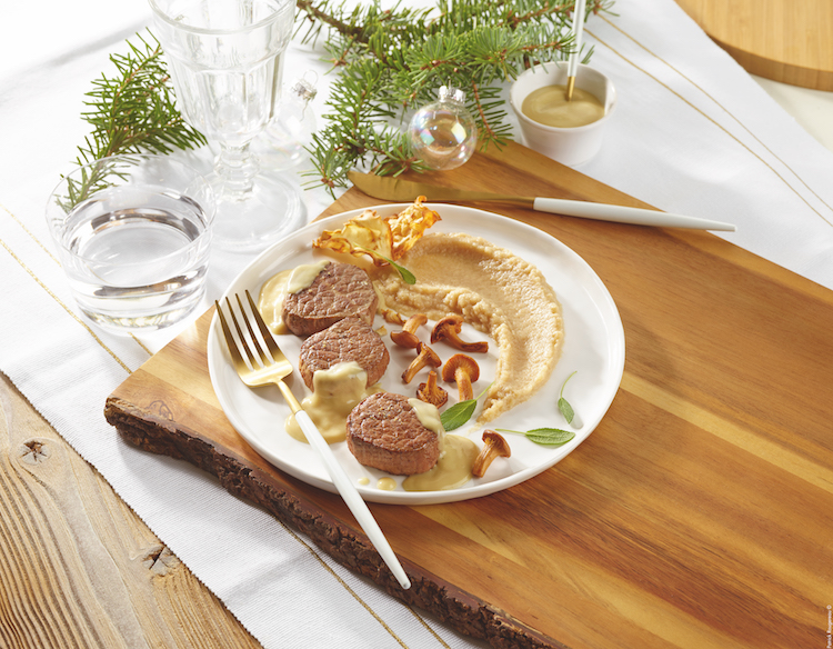 MEDAILLONS DE BŒUF, SAUCE AU FOIE GRAS ET DECLINAISON DE CELERI EN DIFFERENTES TEXTURES