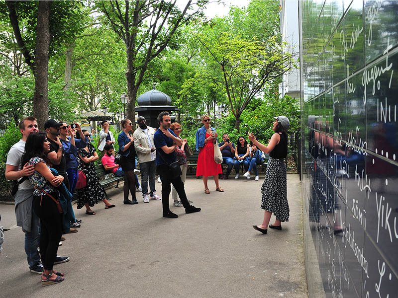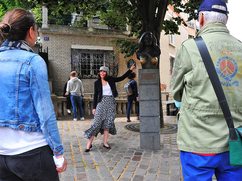 Les lieux emblématiques qui ont fait la renommée du village se dévoilent tout au long du parcours. On reconnaît l'ancien bal musette du Moulin de la Galette, le restaurant iconique de la Maison Rose, le cabaret typique Au Lapin Agile, le célèbre Mur des je t'aime… Casquette gavroche vissée sur la tête à la manière des Poulbots de la Butte, Anne-Sophie chante et raconte Montmartre. La vie sentimentale chaotique d'Édith Piaf fait rire ! Les débuts difficiles de Jacques Brel étonnent ! Les cuites de Charles Aznavour font sourire ! La mélancolie permanente de Dalida émeut…