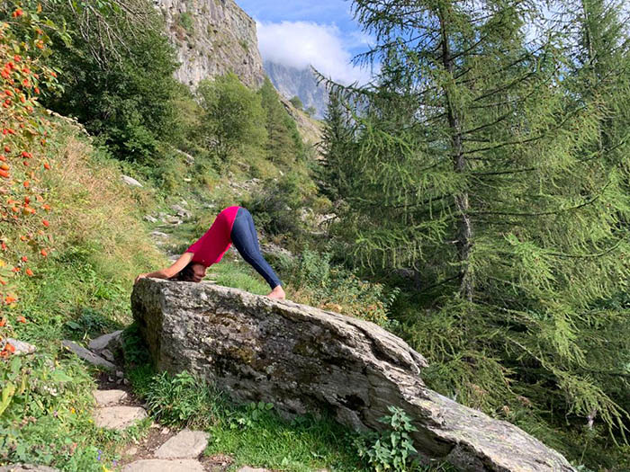 Reconnectés à la nature environnante dans ce lieu favorisant la contemplation, Maya nous donne ensuite les clés pour se relier à notre propre nature profonde lors de ce stage de cinq jours. Anciennement kinésithérapeute et danseuse de Bharata Natyam (danse indienne traditionnelle), Maya nous enseigne avec une grande bienveillance la pratique du Hatha yoga. En petit groupe de maximum cinq personnes, dans le chalet des Trolles dédié à la pratique du yoga, Maya s'adapte à ses stagiaires au fur et à mesure de la séance offrant ainsi un enseignement personnalisé et de grande qualité. Le séjour est ponctué chaque matin d'une marche silencieuse dans la montagne accompagné d'un moment de contemplation face un paysage propice à la relaxation. Entre éveil corporel, méditation, salutation à la montagne, relaxation profonde, mudra, chants… le yoga devient une évidence pour retrouver sa paix intérieure et écouter sa vibration profonde afin d'être au plus près du meilleur de soi-même.