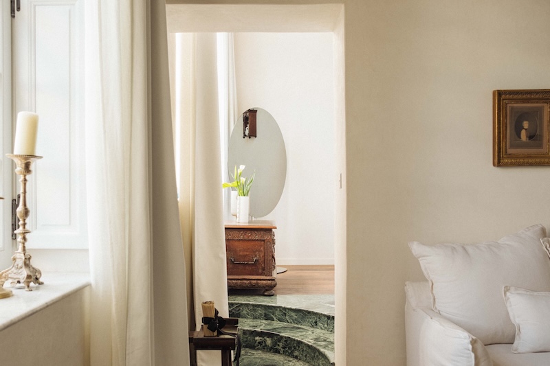 Les Junior Suites (4 unités) : Les suites Fica et Lariccio (38 m²) intègrent un coin salon chaleureux. La Junior Suite Scopa, quant à elle, se distingue par une architecture singulière : sa chambre surélevée, accessible par un escalier en marbre vert, offre une vue plongeante sur les cèdres du Liban et les sommets.