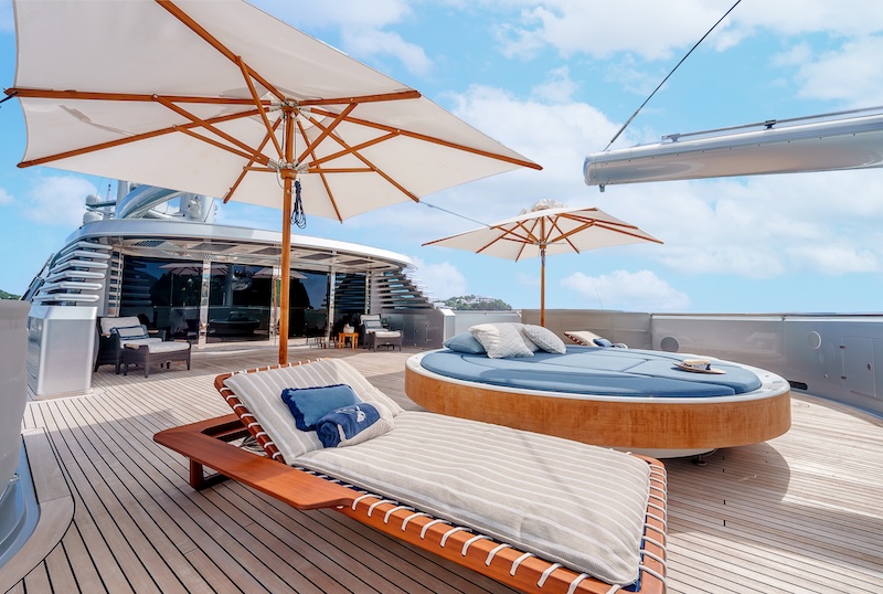 The Maltese Falcon propose une expérience complète, incluant un atrium spectaculaire sur trois niveaux, un cinéma en plein air projeté sur la voile inférieure, un sunbed circulaire pivotant, ainsi qu'un espace bien-être avec salle de massage et studio de fitness. Une large sélection de sports nautiques complète l'offre.